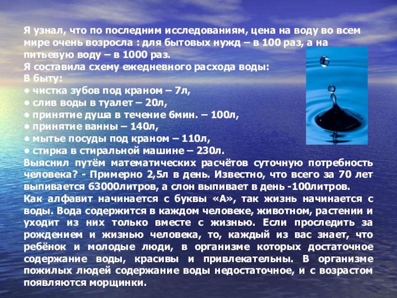 Слайд 10Я узнал, что по последним исследованиям, цена на воду во всем