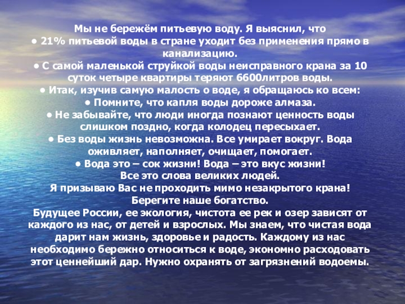 Будущее России, ее экология, чистота ее рек и озер зависят от каждого из нас, от детей и взрослых. Мы знаем, что чистая вода дарит нам жизнь, здоровье и радость. Каждому из нас необходимо бережно относиться к воде, экономно расходовать этот ценнейший дар. Нужно охранять от загрязнений водоемы.