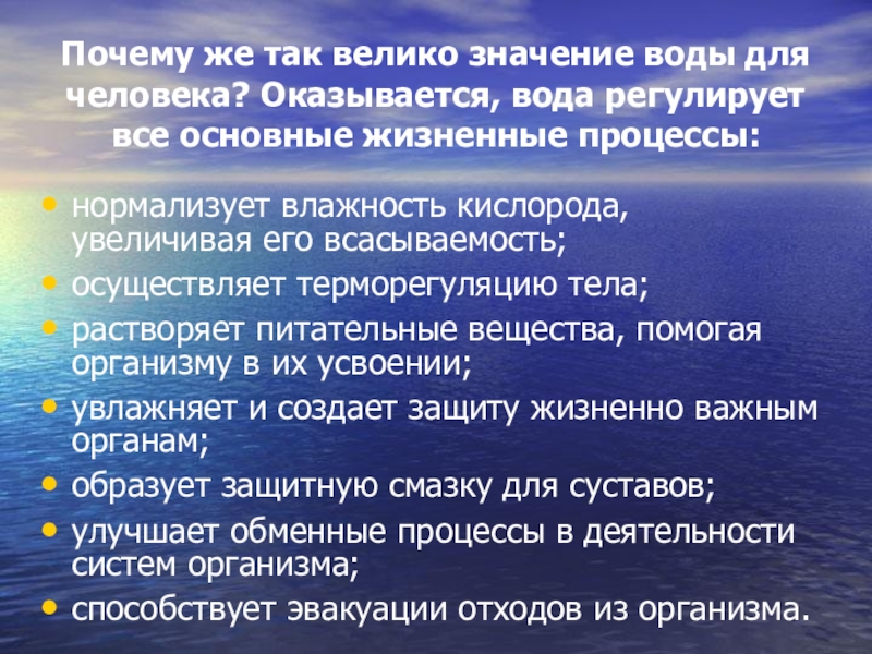 Слайд 9Почему же так велико значение воды для человека? Оказывается, вода регулирует