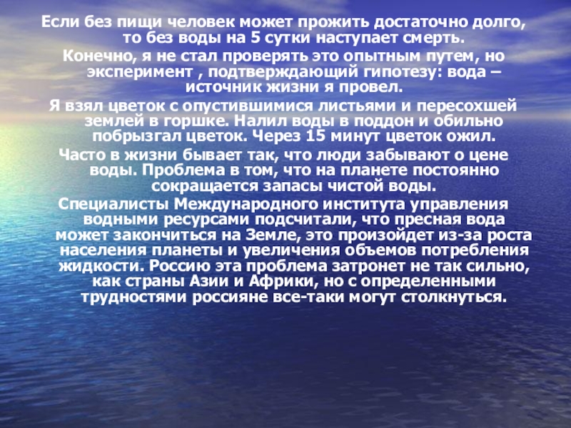 • Без воды жизнь невозможна. Все умирает вокруг. Вода оживляет, наполняет, очищает, помогает.