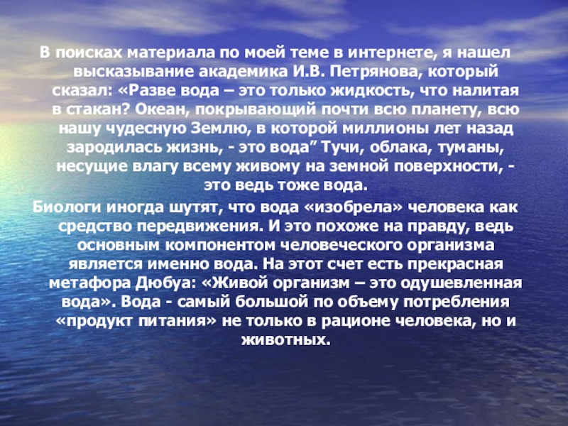 академика И.В. Петрянова, который сказал: «Разве вода – это только жидкость, что налитая в стакан? Океан, покрывающий почти всю планету, всю нашу чудесную Землю, в которой миллионы лет назад зародилась жизнь, - это вода” Тучи, облака, туманы, несущие влагу всему живому на земной поверхности, - это ведь тоже вода.