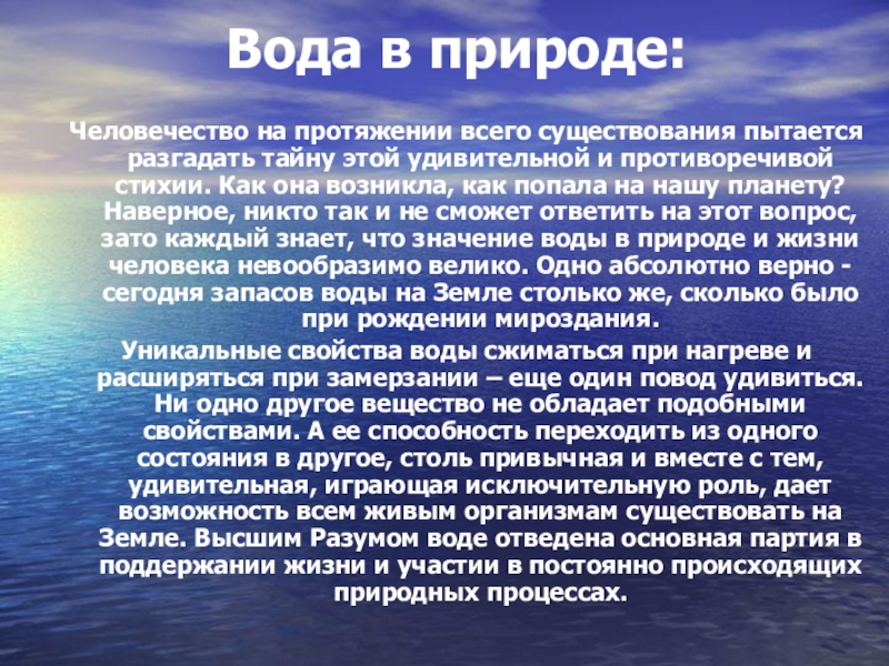 удивительной и противоречивой стихии. Как она возникла, как попала на нашу планету? Наверное, никто так и не сможет ответить на этот вопрос, зато каждый знает, что значение воды в природе и жизни человека невообразимо велико. Одно абсолютно верно - сегодня запасов воды на Земле столько же, сколько было при рождении мироздания.