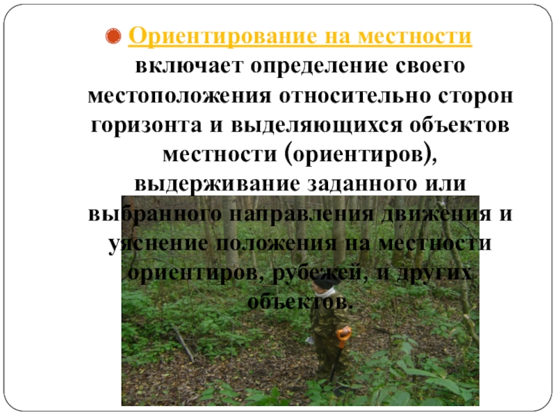 Ориентирование на местности включает определение своего местоположения относительно сторон горизонта и выделяющихся объектов местности (ориентиров), выдерживание заданного
