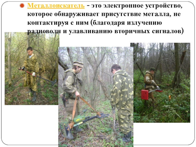 Слайд 8Металлоискатель - это электронное устройство, которое обнаруживает присутствие металла, не контактируя