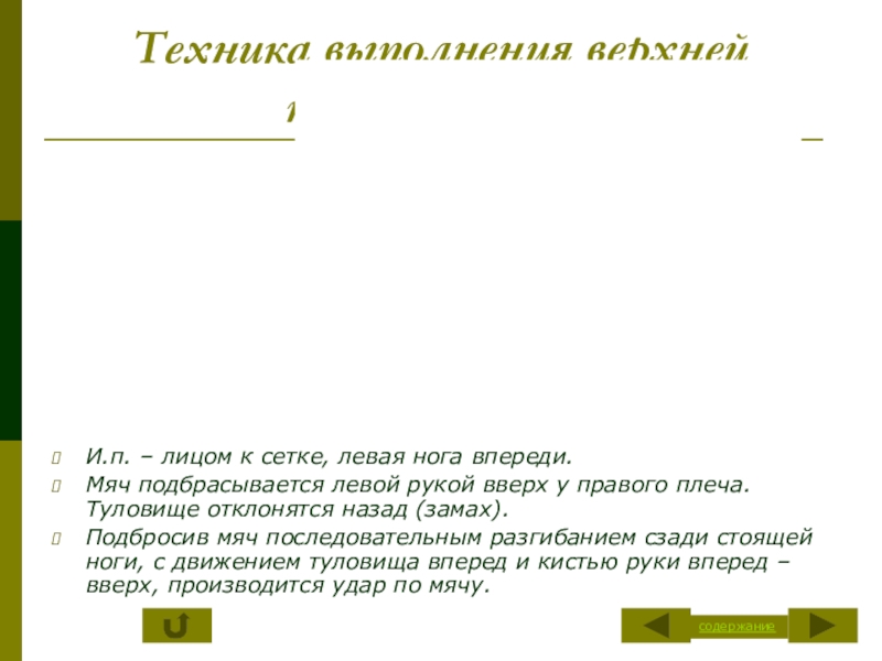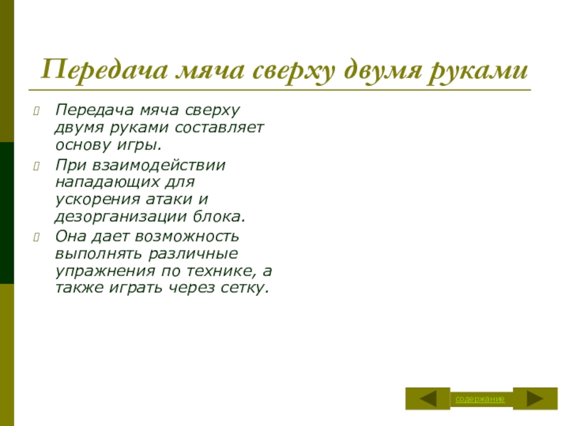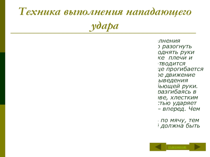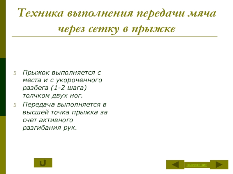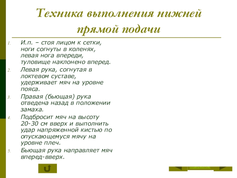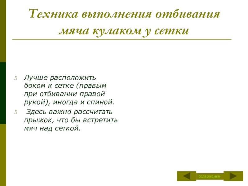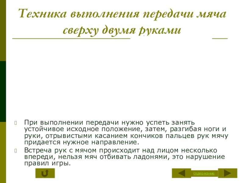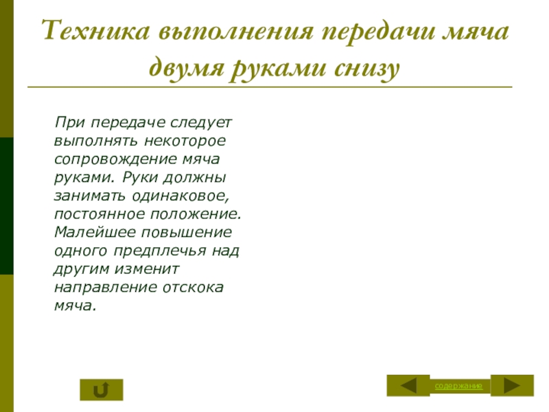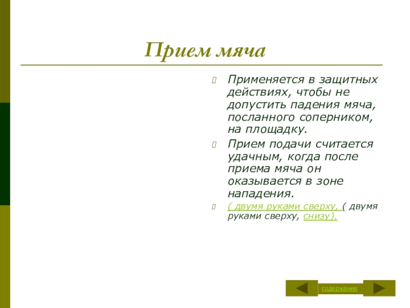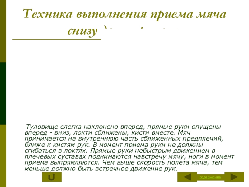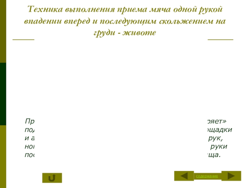 Применяют в основном юноши. Игрок как бы «ныряет» под мяч, после отбивания мяча руки касаются площадки и амортизируют касание грудью за счет сгибания рук, ноги сгибаются в коленях, туловище прогибается, руки после отталкивания вперед убирают вдоль туловища.