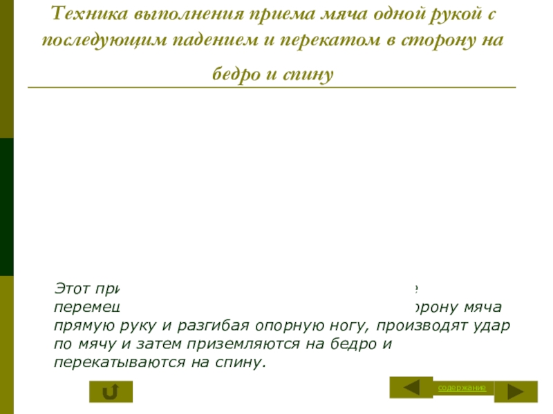 Этот прием применяют чаще девушки. После перемещения делают выпад, выставляя в сторону мяча прямую руку и разгибая опорную ногу, производят удар по мячу и затем приземляются на бедро и перекатываются на спину.