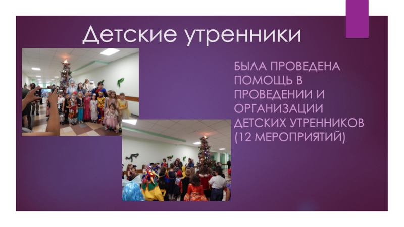Детские утренникиБыла проведена помощь в проведении и организации детских утренников (12 мероприятий)