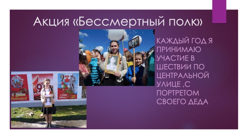 Акция «Бессмертный полк»Каждый год я принимаю участие в шествии по центральной улице ,с портретом своего деда