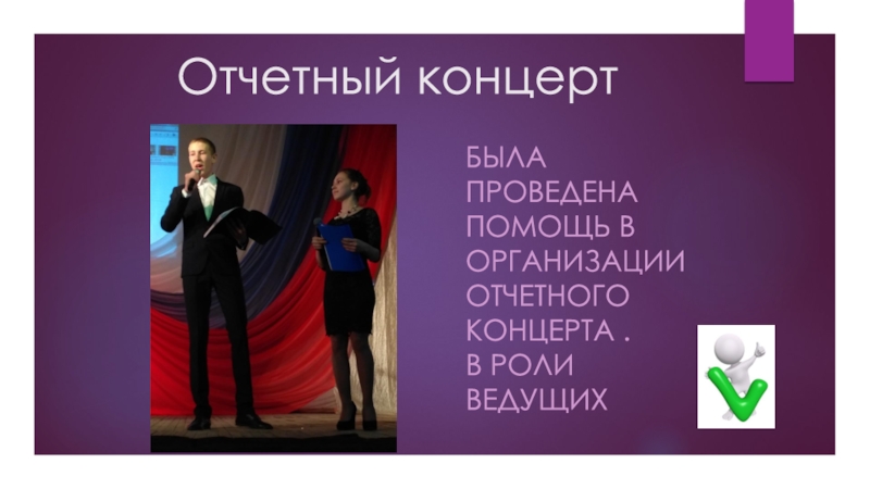 Отчетный концертБыла проведена помощь в организации отчетного концерта .       В роли