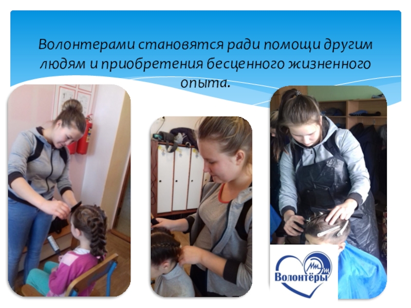 Слайд 7Волонтерами становятся ради помощи другим людям и приобретения бесценного жизненного опыта.
