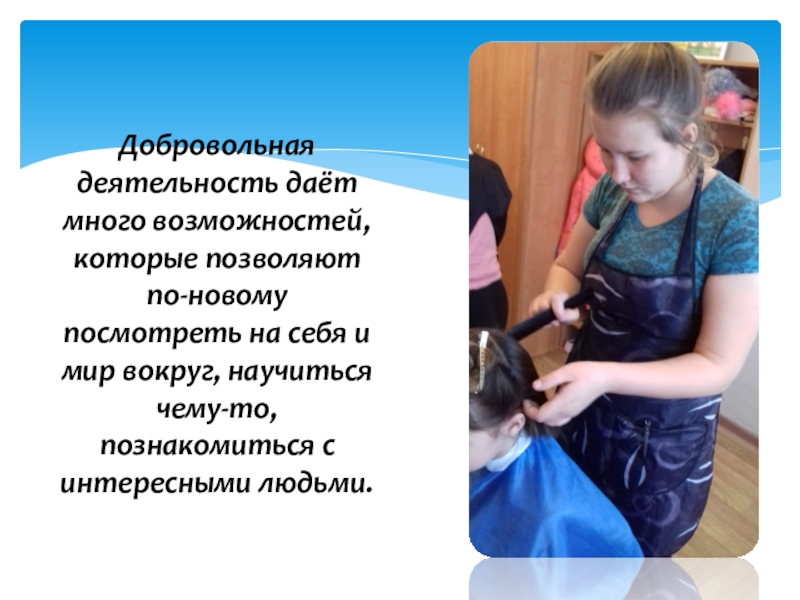 Слайд 8Добровольная деятельность даёт много возможностей, которые позволяют по-новому посмотреть на себя