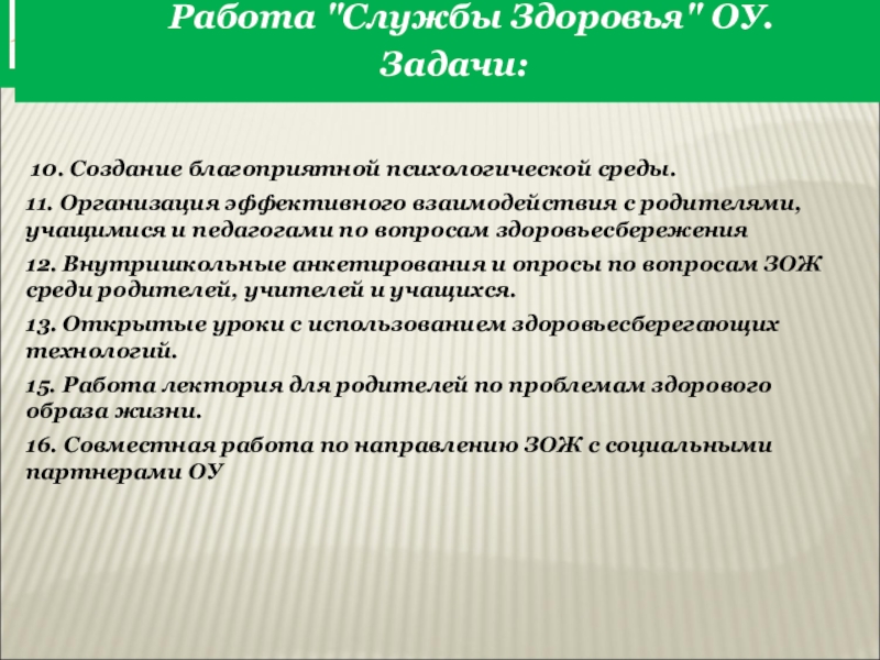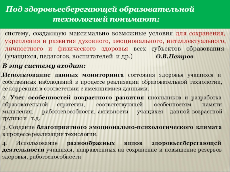 систему, создающую максимально возможные условия для сохранения, укрепления и развития духовного, эмоционального, интеллектуального, личностного и физического здоровья всех субъектов образования (учащихся, педагогов, воспитателей и др.) О.В.Петров