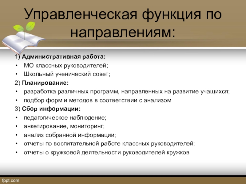Управленческая функция по направлениям:1) Административная работа:МО классных руководителей;Школьный ученический совет;2) Планирование:разработка различных программ, направленных на развитие учащихся;подбор