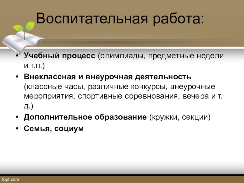 Воспитательная работа:Учебный процесс (олимпиады, предметные недели и т.п.)Внеклассная и внеурочная деятельность (классные часы, различные конкурсы, внеурочные мероприятия, спортивные соревнования, вечера и т.д.)Дополнительное образование (кружки, секции)Семья, социум