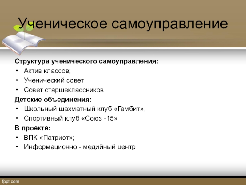 Ученическое самоуправлениеСтруктура ученического самоуправления:Актив классов;Ученический совет;Совет старшеклассниковДетские объединения:Школьный шахматный клуб «Гамбит»;Спортивный клуб «Союз -15»В проекте:ВПК «Патриот»;Информационно -
