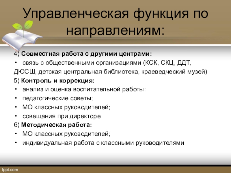 Управленческая функция по направлениям:4) Совместная работа с другими центрами:связь с общественными организациями (КСК, СКЦ, ДДТ, ДЮСШ, детская