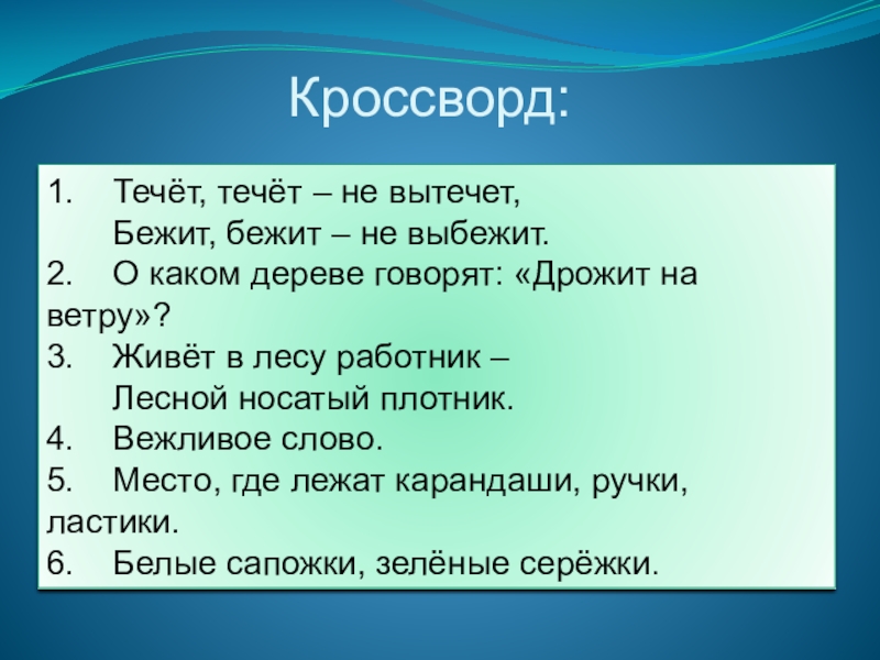 Кроссворд:1.    Течёт, течёт – не вытечет, Бежит, бежит – не выбежит. 2.    О каком дереве говорят: «Дрожит на