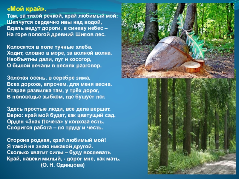 «Мой край».Там, за тихой речкой, край любимый мой:Шепчутся сердечно ивы над водой,Вдаль ведут дороги, в синеву небес