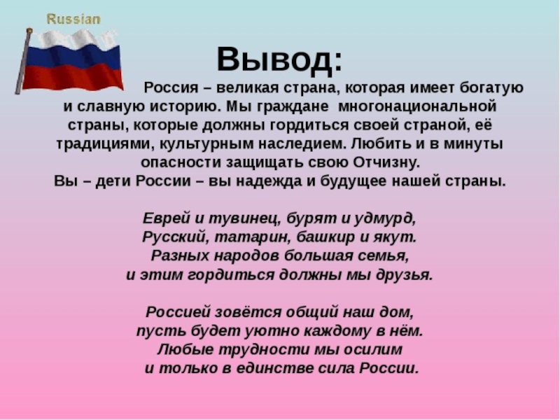 Презентация, доклад воспитательного занятияМоя Родина - Россия