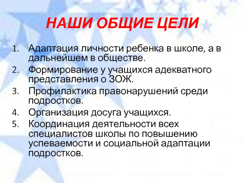 НАШИ ОБЩИЕ ЦЕЛИАдаптация личности ребенка в школе, а в дальнейшем в обществе.Формирование у учащихся адекватного представления о
