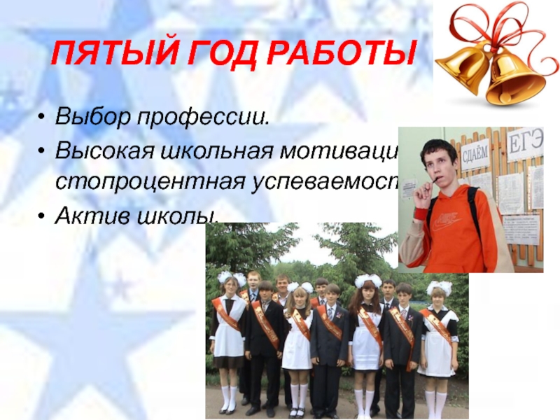 ПЯТЫЙ ГОД РАБОТЫВыбор профессии.Высокая школьная мотивация, стопроцентная успеваемость.Актив школы.