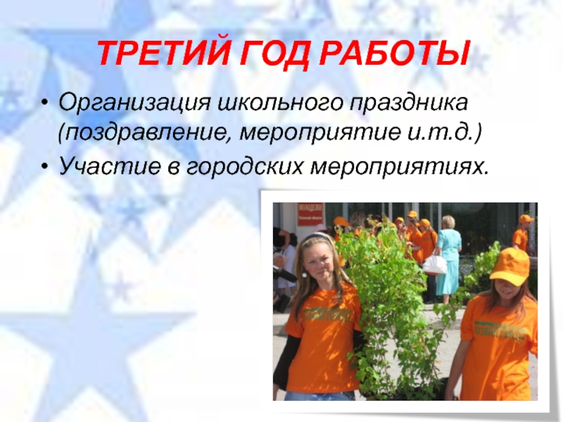 ТРЕТИЙ ГОД РАБОТЫОрганизация школьного праздника (поздравление, мероприятие и.т.д.)Участие в городских мероприятиях.