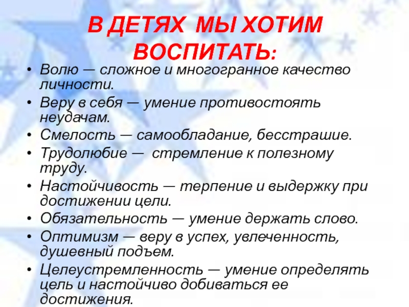 В ДЕТЯХ МЫ ХОТИМ ВОСПИТАТЬ:Волю — сложное и многогранное качество личности.Веру в себя — умение противостоять неудачам.Смелость
