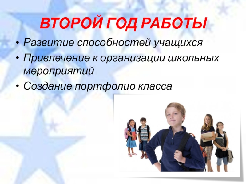 ВТОРОЙ ГОД РАБОТЫРазвитие способностей учащихсяПривлечение к организации школьных мероприятийСоздание портфолио класса