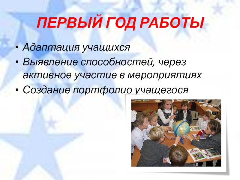 ПЕРВЫЙ ГОД РАБОТЫАдаптация учащихсяВыявление способностей, через активное участие в мероприятияхСоздание портфолио учащегося
