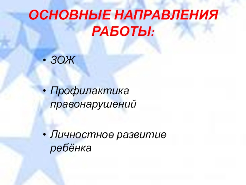 ОСНОВНЫЕ НАПРАВЛЕНИЯ РАБОТЫ:ЗОЖПрофилактика правонарушенийЛичностное развитие ребёнка