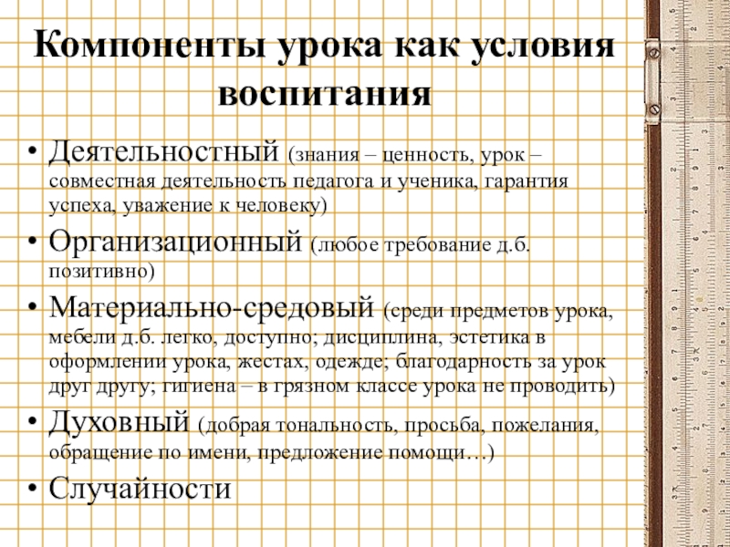 Материально-средовый (среди предметов урока, мебели д.б. легко, доступно; дисциплина, эстетика в оформлении урока, жестах, одежде; благодарность за урок друг другу; гигиена – в грязном классе урока не проводить)