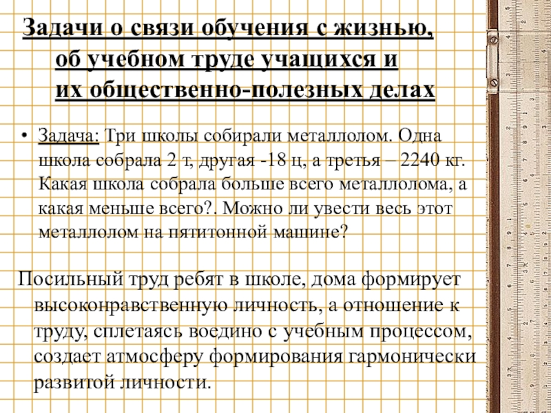 Задача: Три школы собирали металлолом. Одна школа собрала 2 т, другая -18 ц, а третья – 2240 кг. Какая школа собрала больше всего металлолома, а какая меньше всего?. Можно ли увести весь этот металлолом на пятитонной машине?