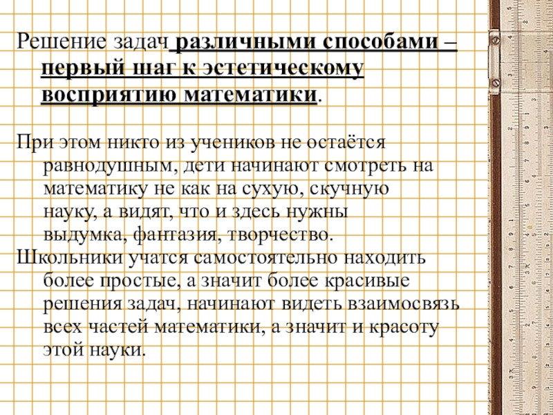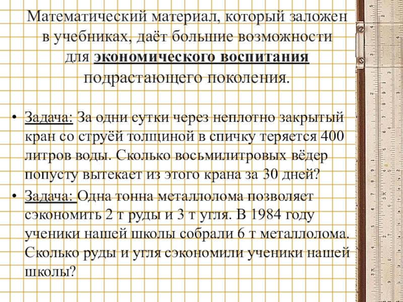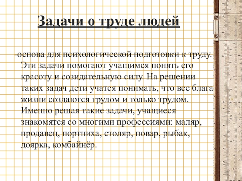 задачи помогают учащимся понять его красоту и созидательную силу. На решении таких задач дети учатся понимать, что все блага жизни создаются трудом и только трудом. Именно решая такие задачи, учащиеся знакомятся со многими профессиями: маляр, продавец, портниха, столяр, повар, рыбак, доярка, комбайнёр.