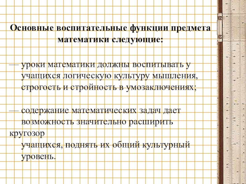 Слайд 9Основные воспитательные функции предмета математики следующие:
