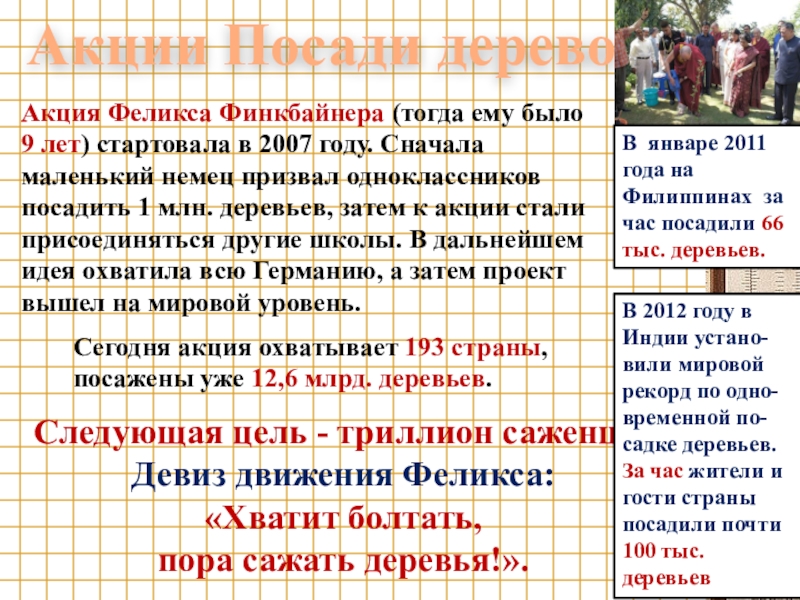 Сегодня акция охватывает 193 страны, посажены уже 12,6 млрд. деревьев.