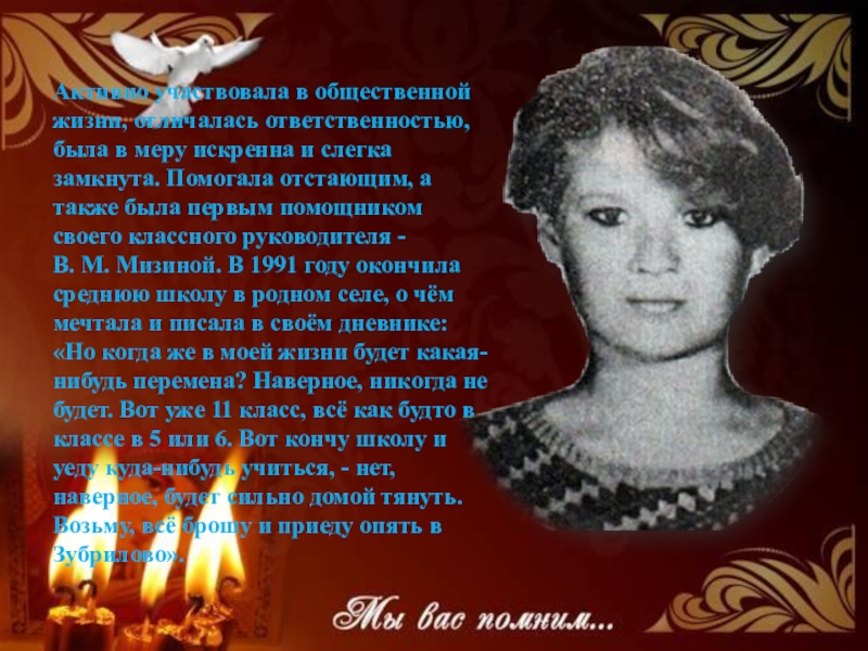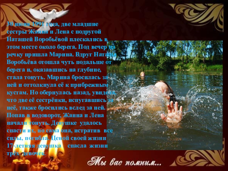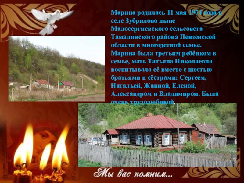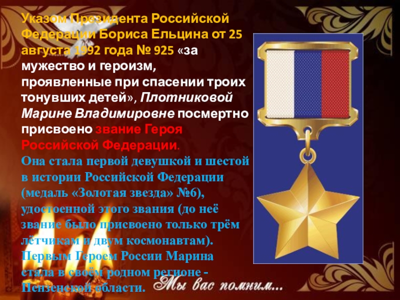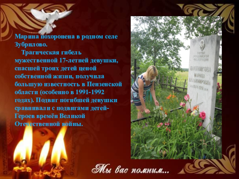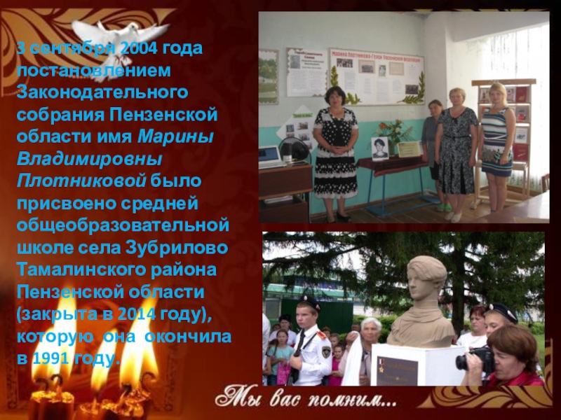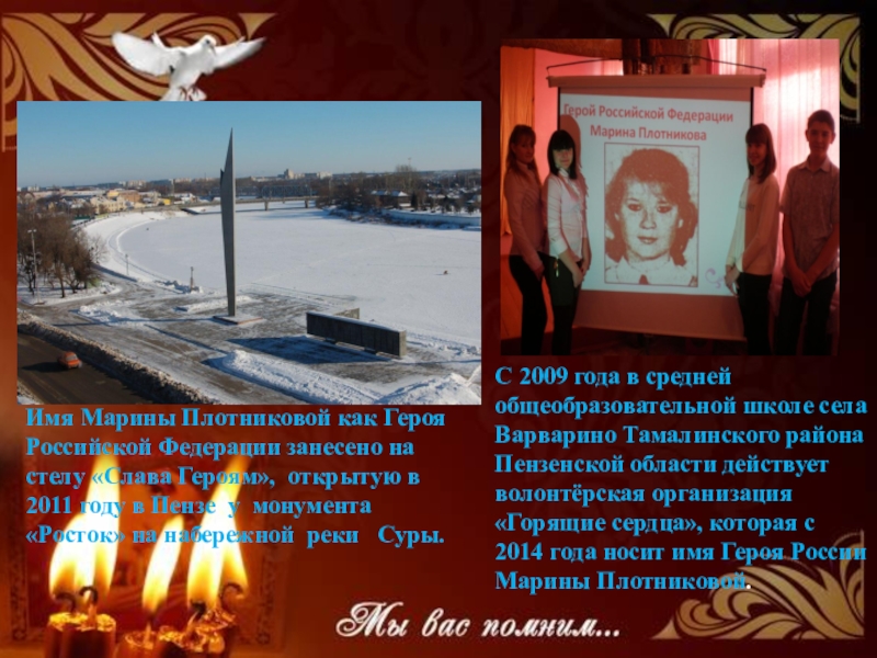 С 2009 года в средней общеобразовательной школе села Варварино Тамалинского района Пензенской области действует волонтёрская организация «Горящие сердца», которая с 2014 года носит имя Героя России Марины Плотниковой.