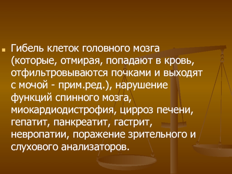 Слайд 15Гибель клеток головного мозга (которые, отмирая, попадают в кровь, отфильтровываются почками