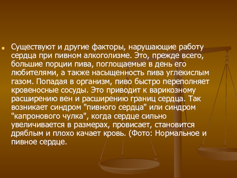 Слайд 9Существуют и другие факторы, нарушающие работу сердца при пивном алкоголизме. Это,