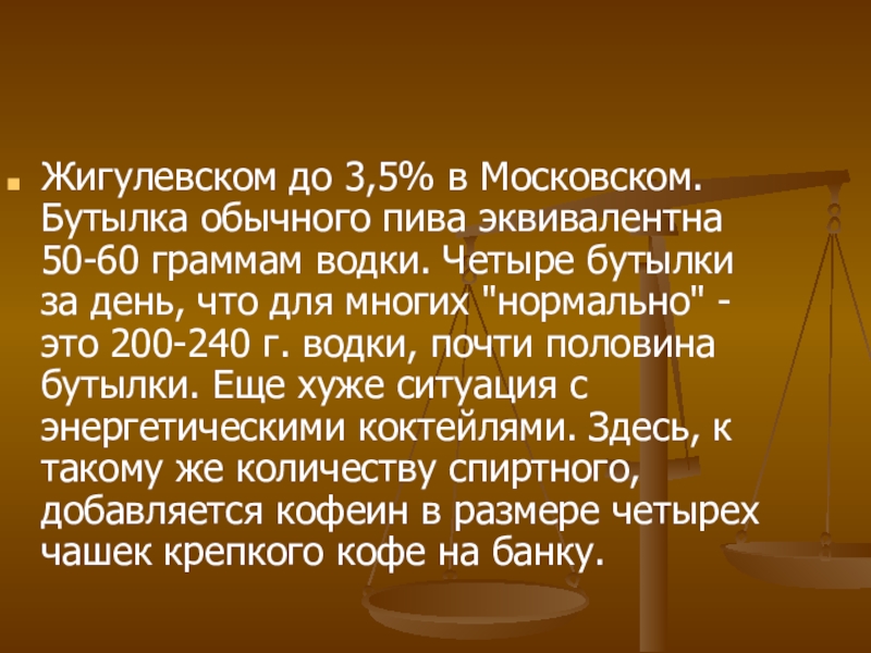 Слайд 4Жигулевском до 3,5% в Московском. Бутылка обычного пива эквивалентна 50-60 граммам