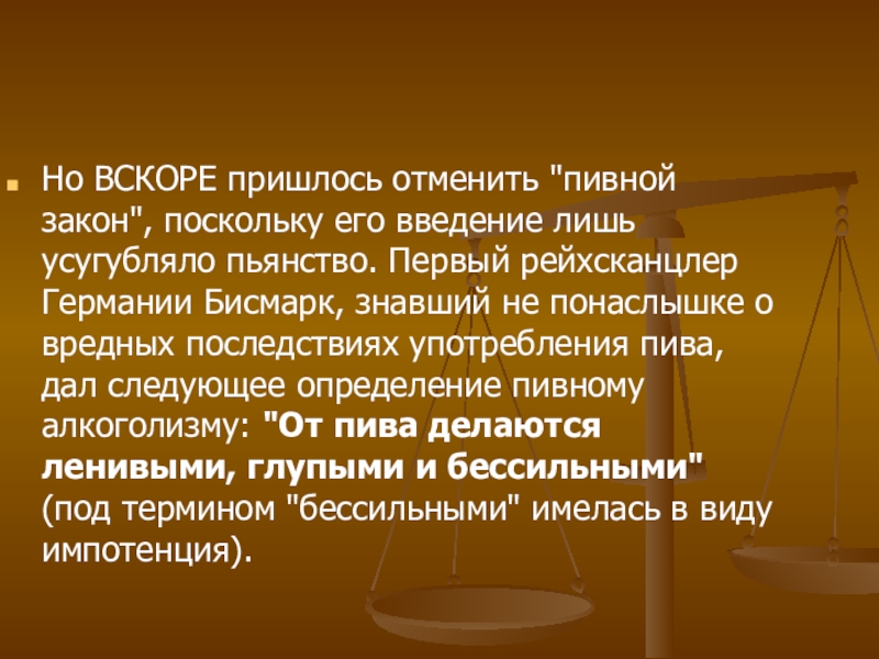 Слайд 6Но ВСКОРЕ пришлось отменить "пивной закон", поскольку его введение лишь усугубляло