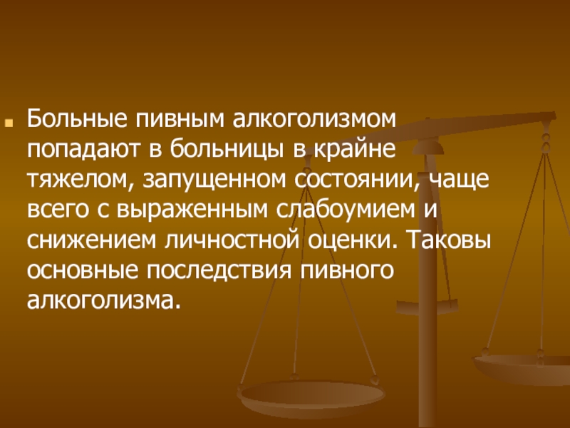 Слайд 17Больные пивным алкоголизмом попадают в больницы в крайне тяжелом, запущенном состоянии,