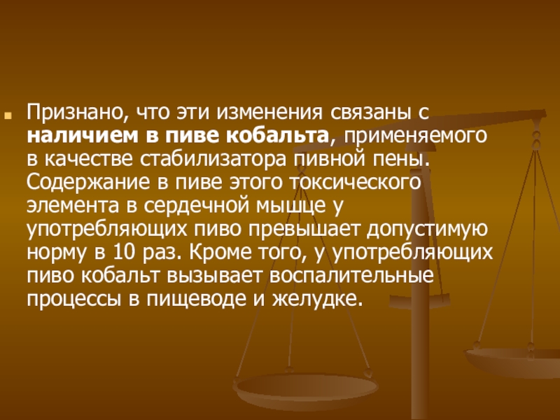 Слайд 8Признано, что эти изменения связаны с наличием в пиве кобальта, применяемого