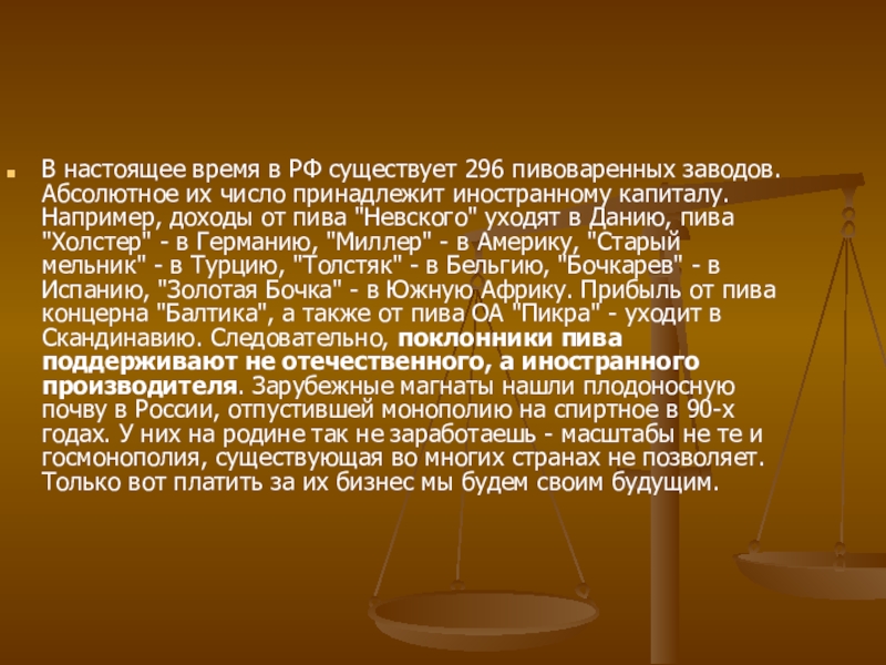 число принадлежит иностранному капиталу. Например, доходы от пива "Невского" уходят в Данию, пива "Холстер" - в Германию, "Миллер" - в Америку, "Старый мельник" - в Турцию, "Толстяк" - в Бельгию, "Бочкарев" - в Испанию, "Золотая Бочка" - в Южную Африку. Прибыль от пива концерна "Балтика", а также от пива ОА "Пикра" - уходит в Скандинавию. Следовательно, поклонники пива поддерживают не отечественного, а иностранного производителя. Зарубежные магнаты нашли плодоносную почву в России, отпустившей монополию на спиртное в 90-х годах. У них на родине так не заработаешь - масштабы не те и госмонополия, существующая во многих странах не позволяет. Только вот платить за их бизнес мы будем своим будущим.