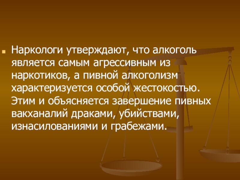 Слайд 19Наркологи утверждают, что алкоголь является самым агрессивным из наркотиков, а пивной