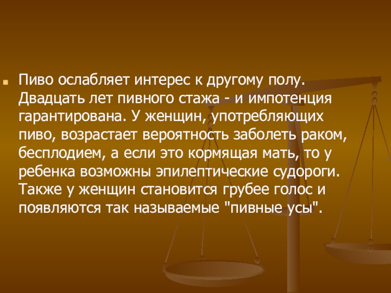 Слайд 12Пиво ослабляет интерес к другому полу. Двадцать лет пивного стажа -