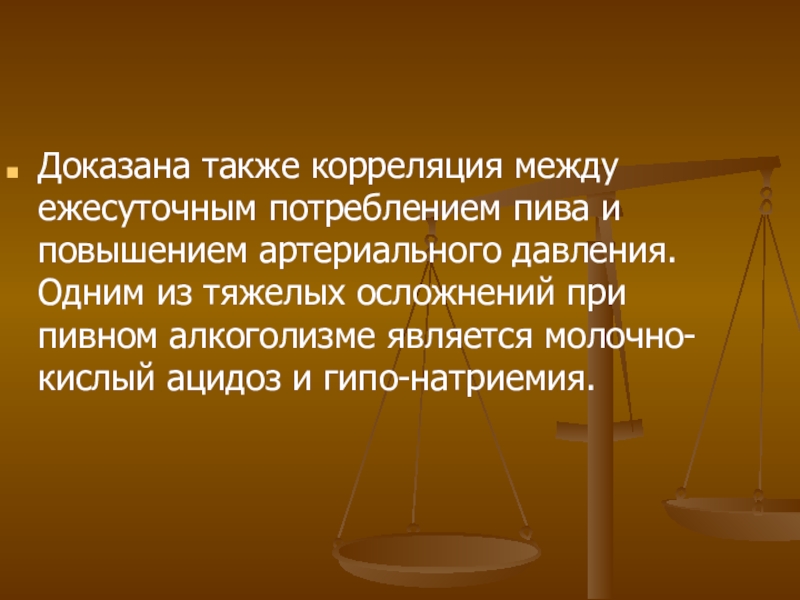 Слайд 16Доказана также корреляция между ежесуточным потреблением пива и повышением артериального давления.