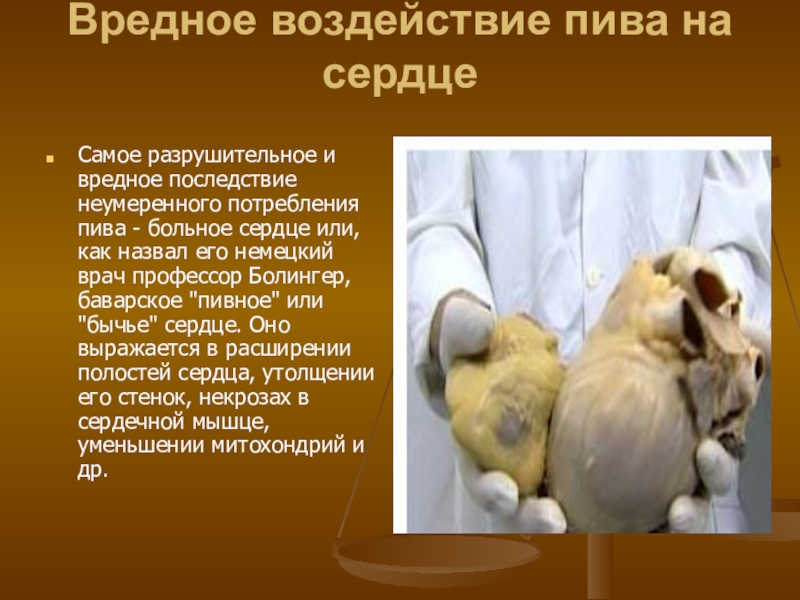 пива - больное сердце или, как назвал его немецкий врач профессор Болингер, баварское "пивное" или "бычье" сердце. Оно выражается в расширении полостей сердца, утолщении его стенок, некрозах в сердечной мышце, уменьшении митохондрий и др.