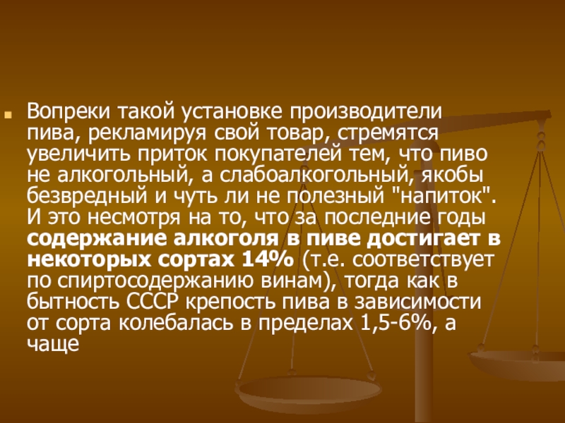 покупателей тем, что пиво не алкогольный, а слабоалкогольный, якобы безвредный и чуть ли не полезный "напиток". И это несмотря на то, что за последние годы содержание алкоголя в пиве достигает в некоторых сортах 14% (т.е. соответствует по спиртосодержанию винам), тогда как в бытность СССР крепость пива в зависимости от сорта колебалась в пределах 1,5-6%, а чаще