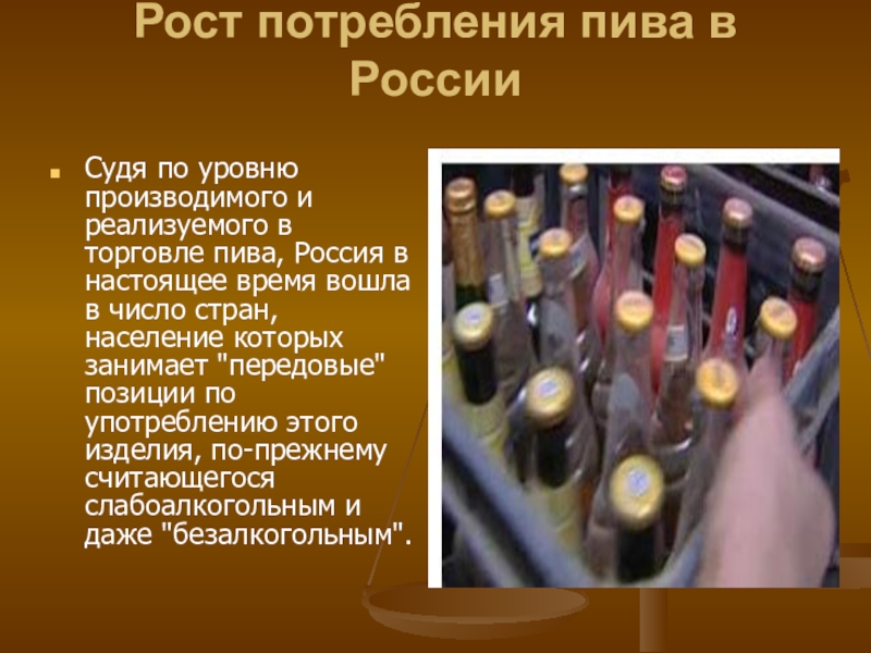 торговле пива, Россия в настоящее время вошла в число стран, население которых занимает "передовые" позиции по употреблению этого изделия, по-прежнему считающегося слабоалкогольным и даже "безалкогольным".