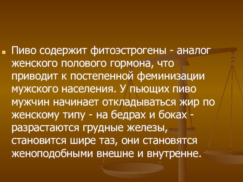 Слайд 11Пиво содержит фитоэстрогены - аналог женского полового гормона, что приводит к